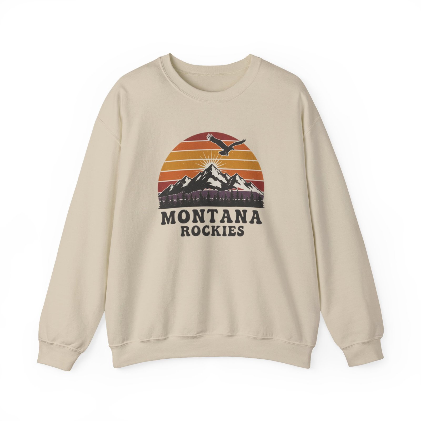 Montana Rockies Crewneck Sweatshirt — Vintage Sunset Mountain Graphic